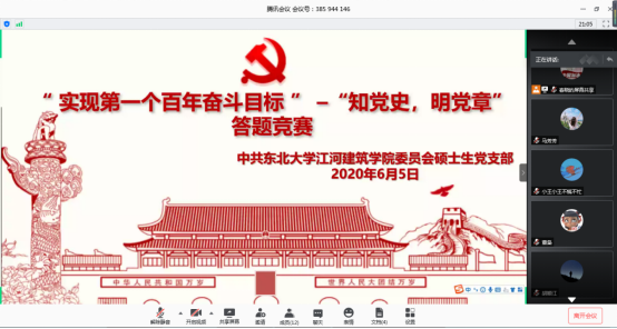 6月5日晚,学院硕士生党支部通过腾讯会议开展主题为“实现第一个百年奋斗目标”——“知党史,明党章”线上答题竞赛活动,党支部全体党员参加活动。