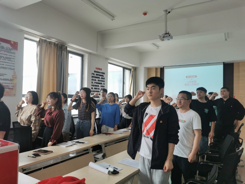 会议伊始,吴泽灿和景萌依次宣读入党志愿书,向支部大会汇报对党的认识、入党动机以及自己在培养考察期间思想、学习、生活、工作中的表现。入党介绍人介绍两位发展对象的有关情况并对她们能否入党表明意见,组织委员周文涛代表支部委员会报告对两位同志的综合政审情况。经与会党员充分讨论,通过无记名投票,一致同意吴泽灿和景萌两位同志加入中国共产党。随后,预备党员进行入党宣誓,正式党员重温入党誓词。