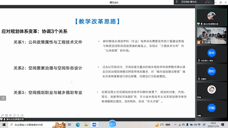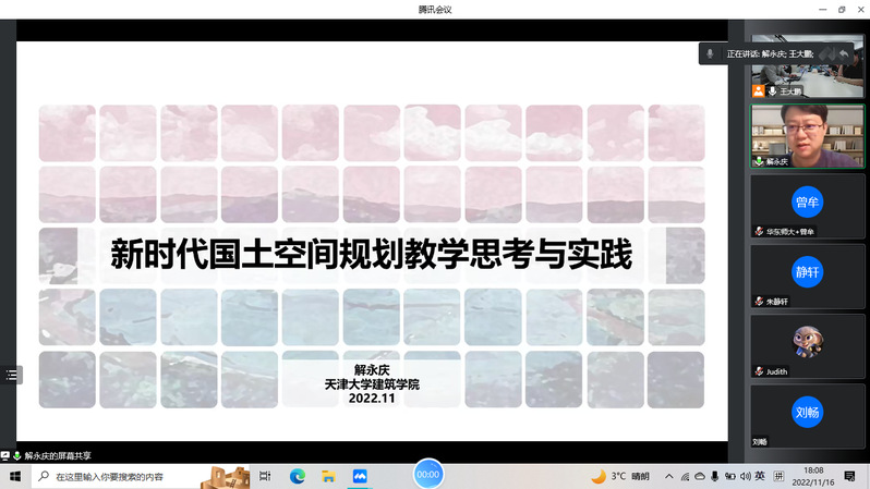 11月16日,应城乡规划系王大鹏老师邀请,天津大学建筑学院英才副教授解永庆老师做客学院“建筑讲坛”(暨献礼百年校庆系列讲座),做题为《新时代国土空间规划教学思考与实践》的学术讲座,学院师生40余人参加线上交流,此外还得到国内其他高校同行的参与关注。