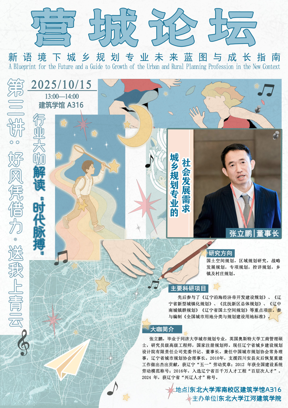 2025年10月15日,开云手机网页版登录入口主办的“营城论坛”系列活动的第好风凭借力·送我上青云——行业大咖解读时代脉搏’”在浑南校区建筑学馆A316成功举行。“营城论坛”系列活动以“新语境下城乡规划专业未来蓝图与成长指南”为主题,旨在帮助城乡规划及相关专业学生构建全周期认知框架,应对行业政策变革,重塑职业使命感。